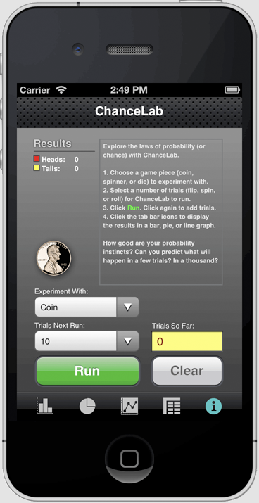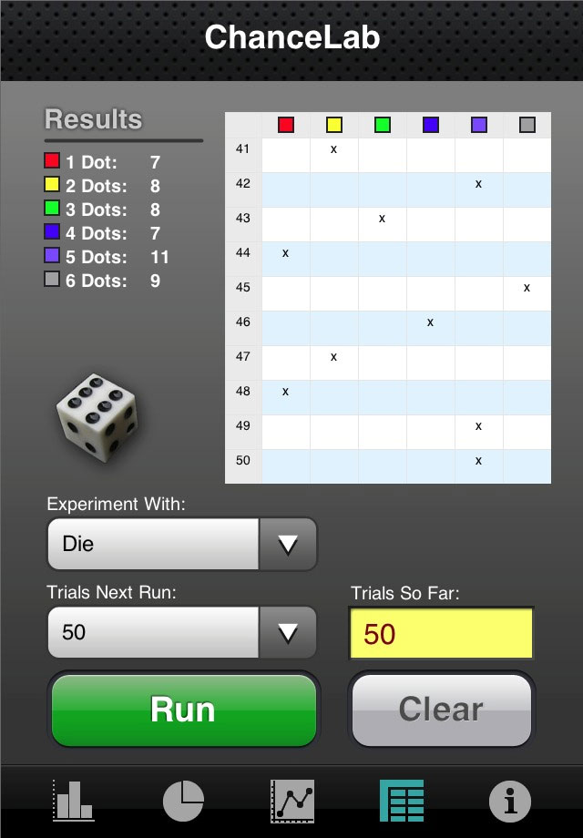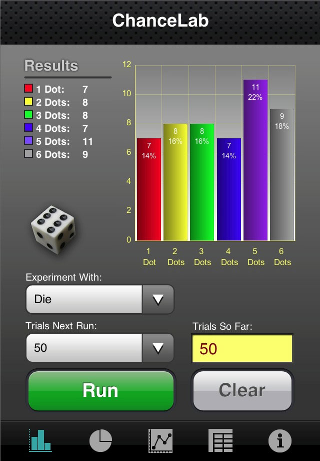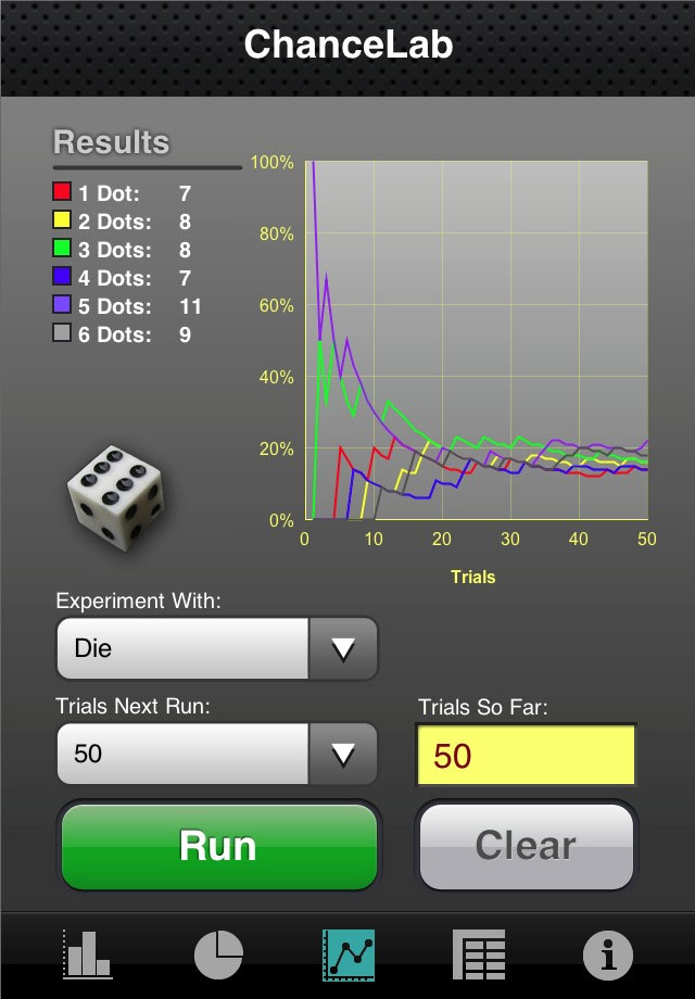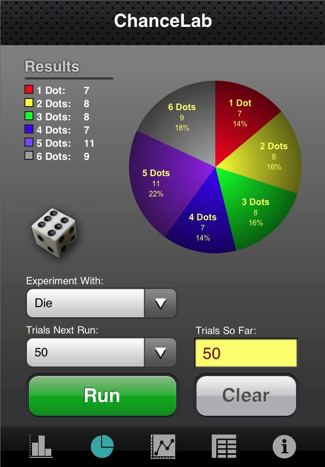 ChanceLab makes it easy and quick to develop your instincts about probability. (Click the image at right for a closer look.) Run experiments from a few trials to a few thousand using a coin, 3-, 4-, or 5-part spinners, or a die. Display the results as a bar chart, a pie chart, a line graph or a table of detailed results.